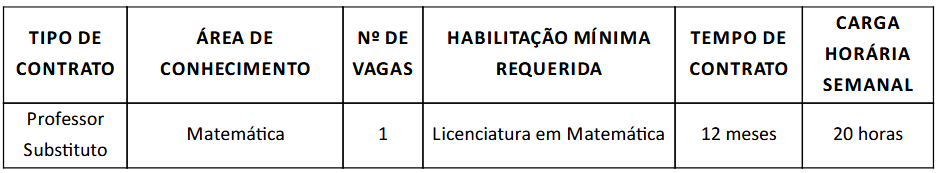 O REITOR DO INSTITUTO FEDERAL DE EDUCAÇÃO, CIÊNCIA E TECNOLOGIA BAIANO, no uso das suas atribuições delegadas pelo Decreto de 26/04/2022, publicado no DOU de 27/04/2022, Seção 2, página 1, e de acordo com as disposições contidas na Lei nº 11.892, de 29/12/2008; na Lei nº 8.112/1990, de 11/12/1990; nos termos da Lei nº 8.745/93, de 9/12/1993 e suas alterações, e nas demais legislações que regem a matéria, torna pública a realização de Processo Seletivo Simplificado, dirigido à contratação, por tempo determinado, de Professor Substituto na Área: Matemática (20h), Campus Itaberaba, conforme condições estabelecidas neste Edital.